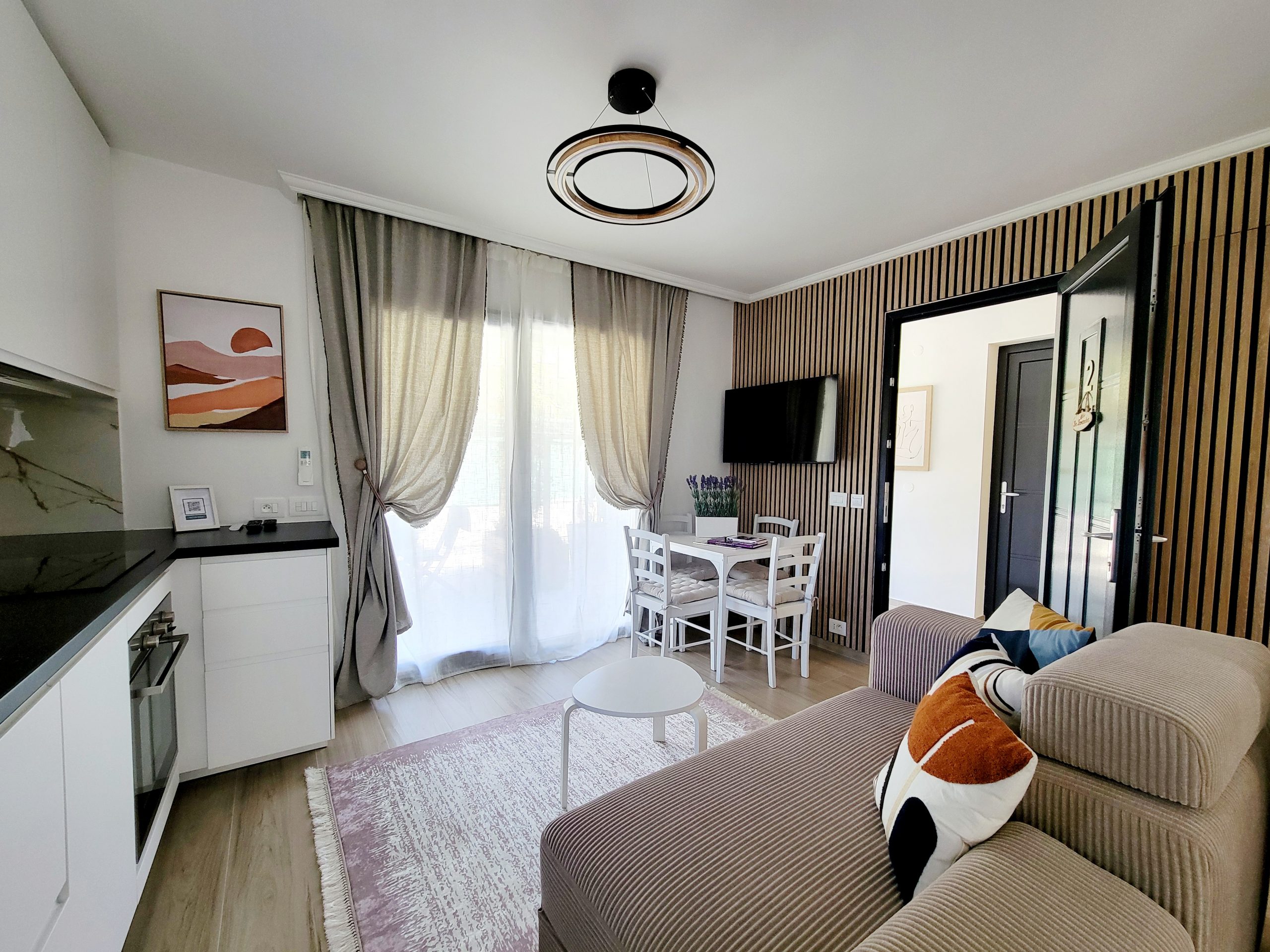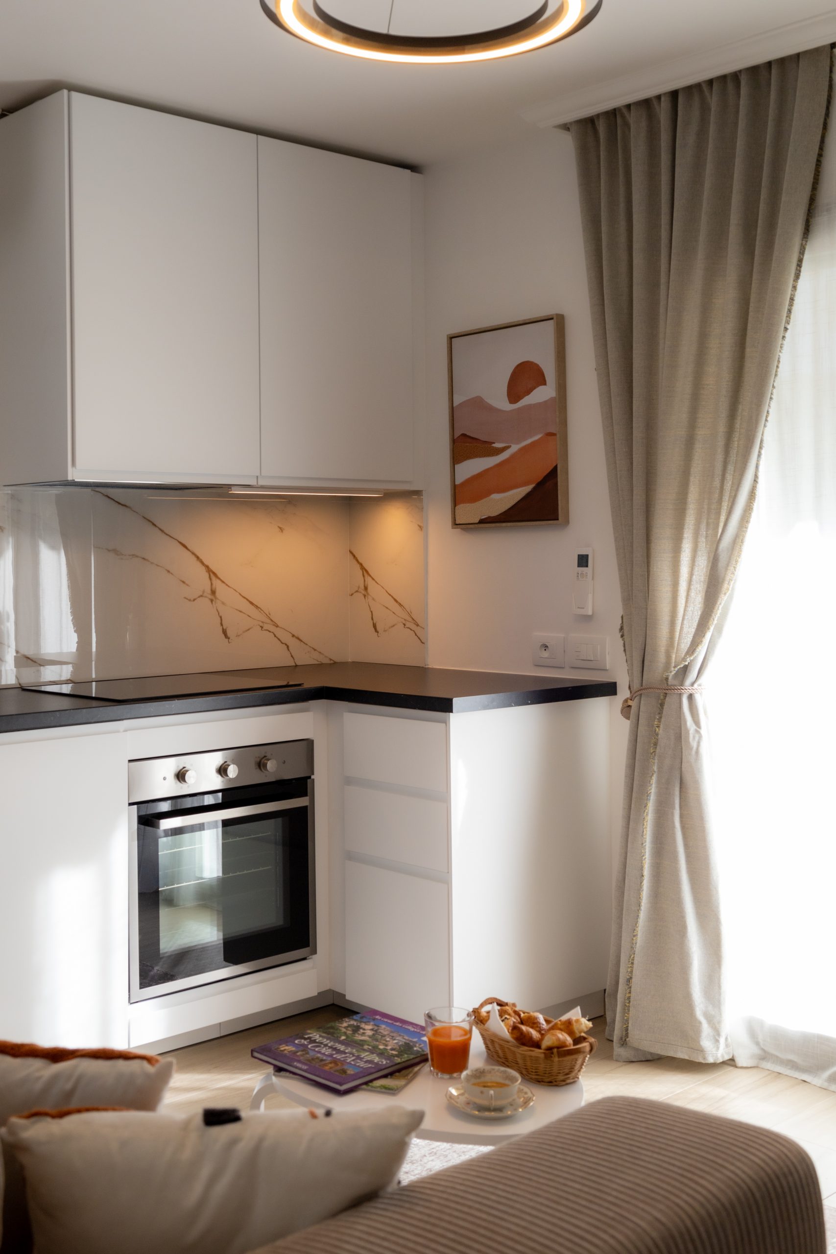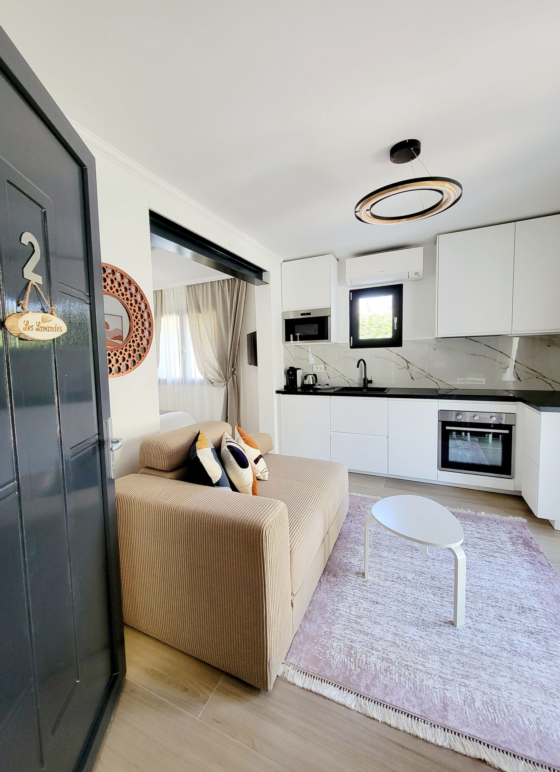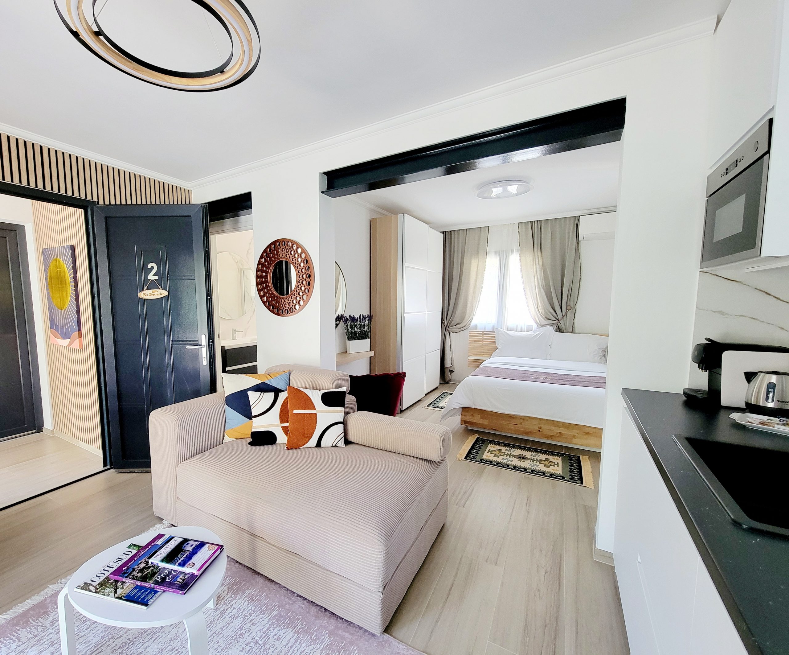 Le studio est composé d’une chambre avec 1 lit double en 140×200, d’une cuisine bien équipée, ouverte sur le séjour, qui comprend une plaque de cuisson, un réfrigérateur/congélateur, un lave-vaisselle et divers ustensiles de cuisine. Vous pourrez également vous faire du café ou du thé grâce à la machine Nespresso et à la bouilloire, tous deux mis à votre disposition.