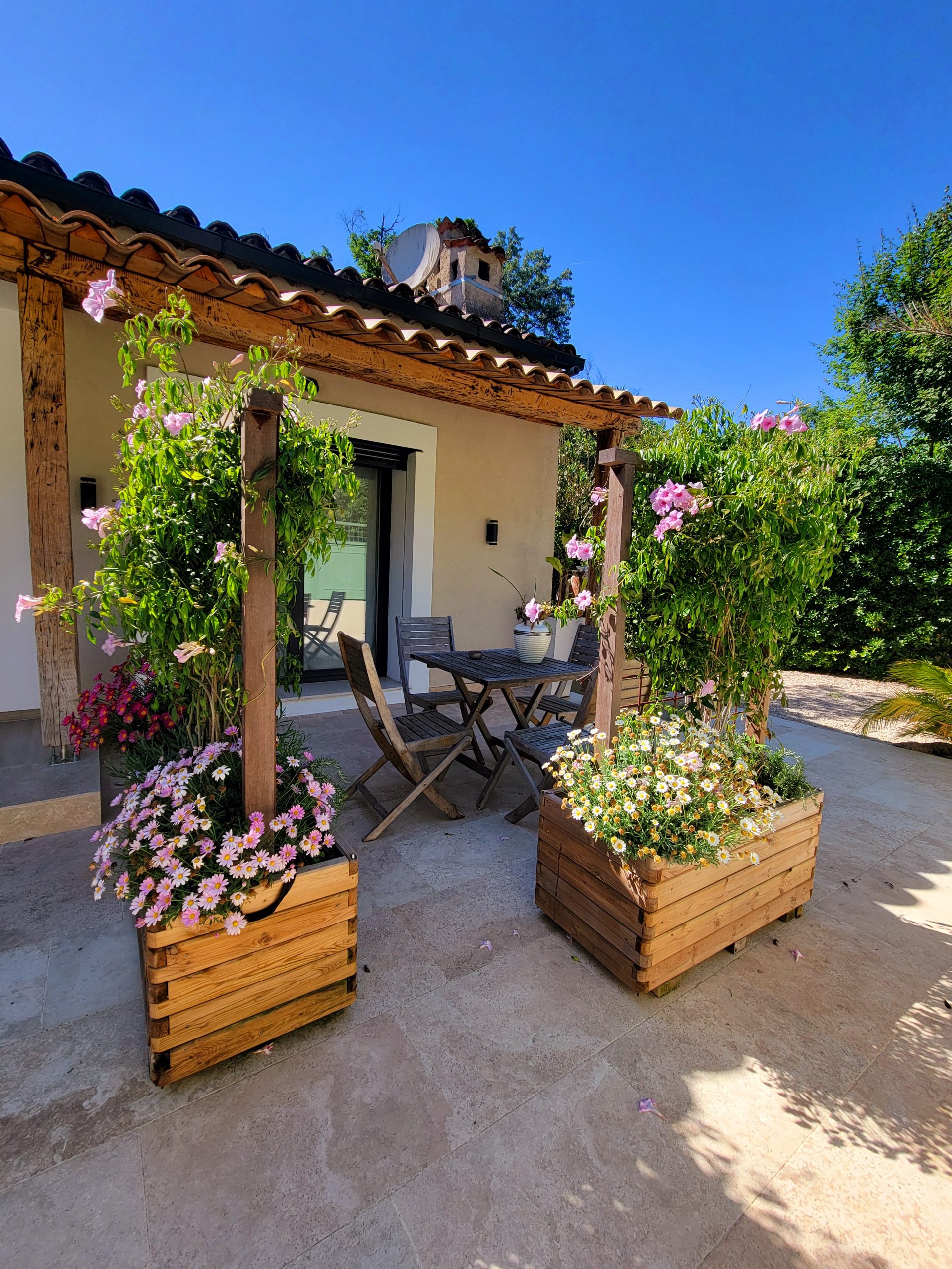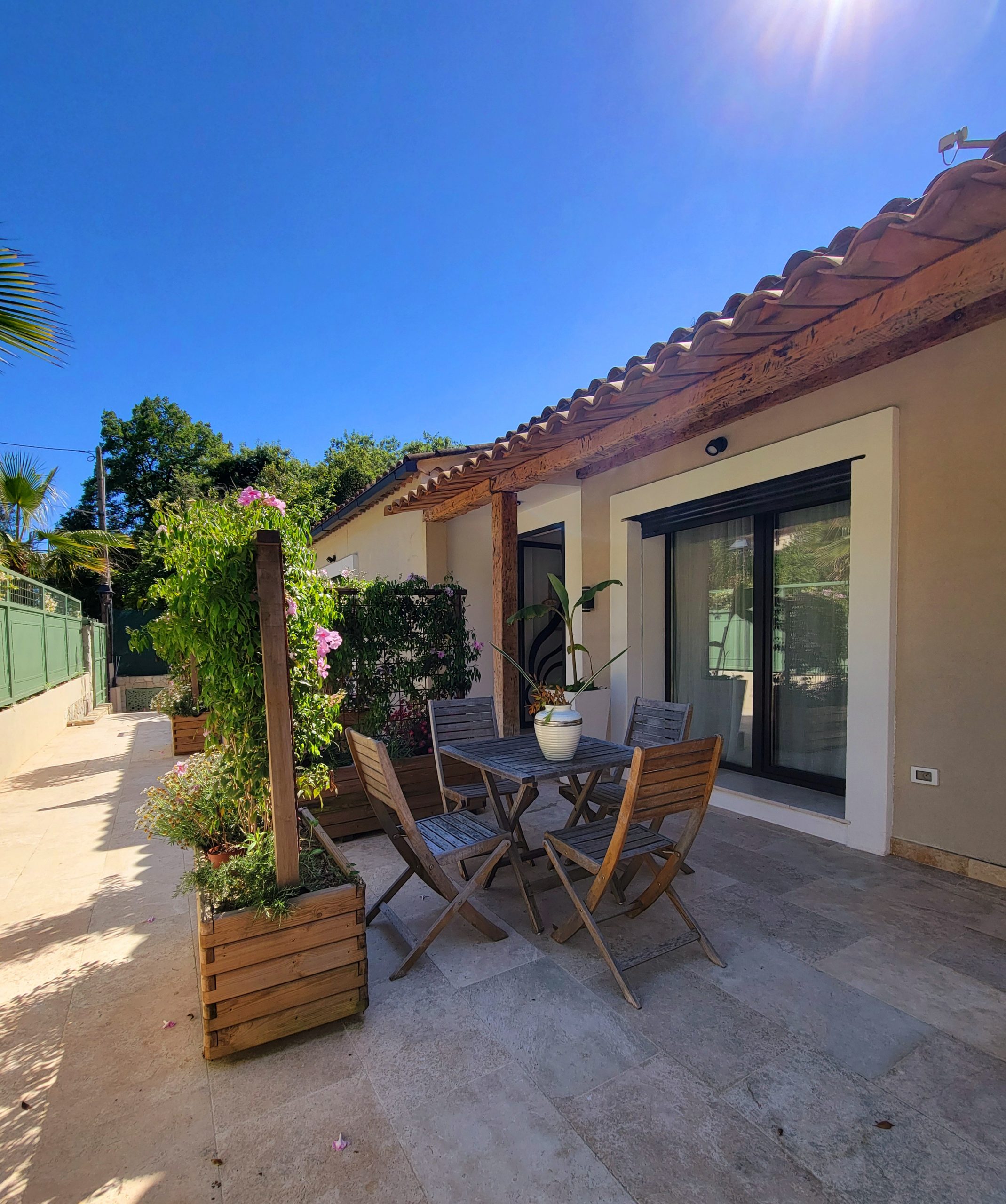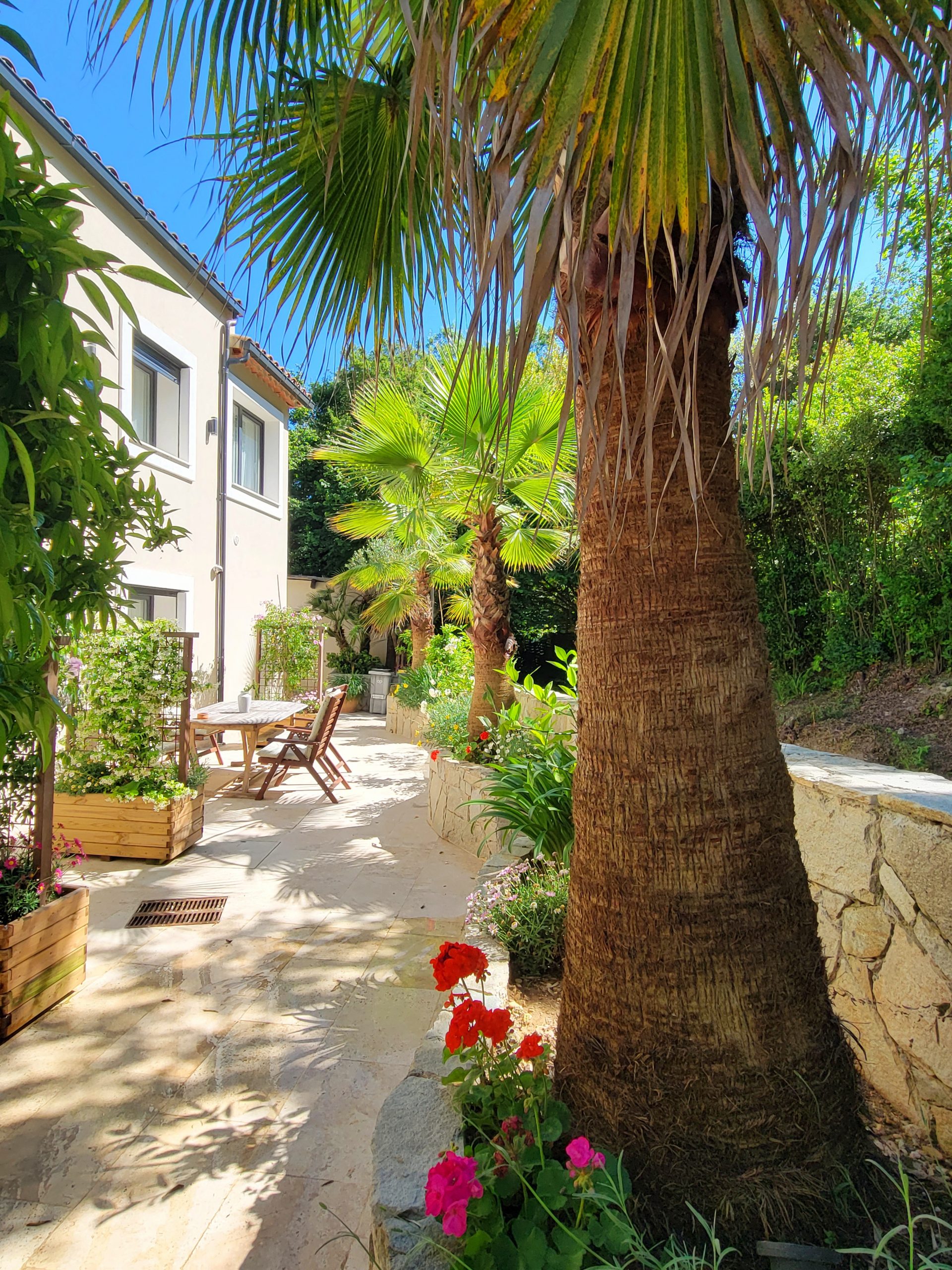 Le studio climatisé (réversible; idéal été comme hiver), comprend également une télévision à écran plat, une salle de douche privative à l’italienne (équipée d’un lave linge/sèche linge) ainsi qu’une terrasse avec vue sur le jardin.