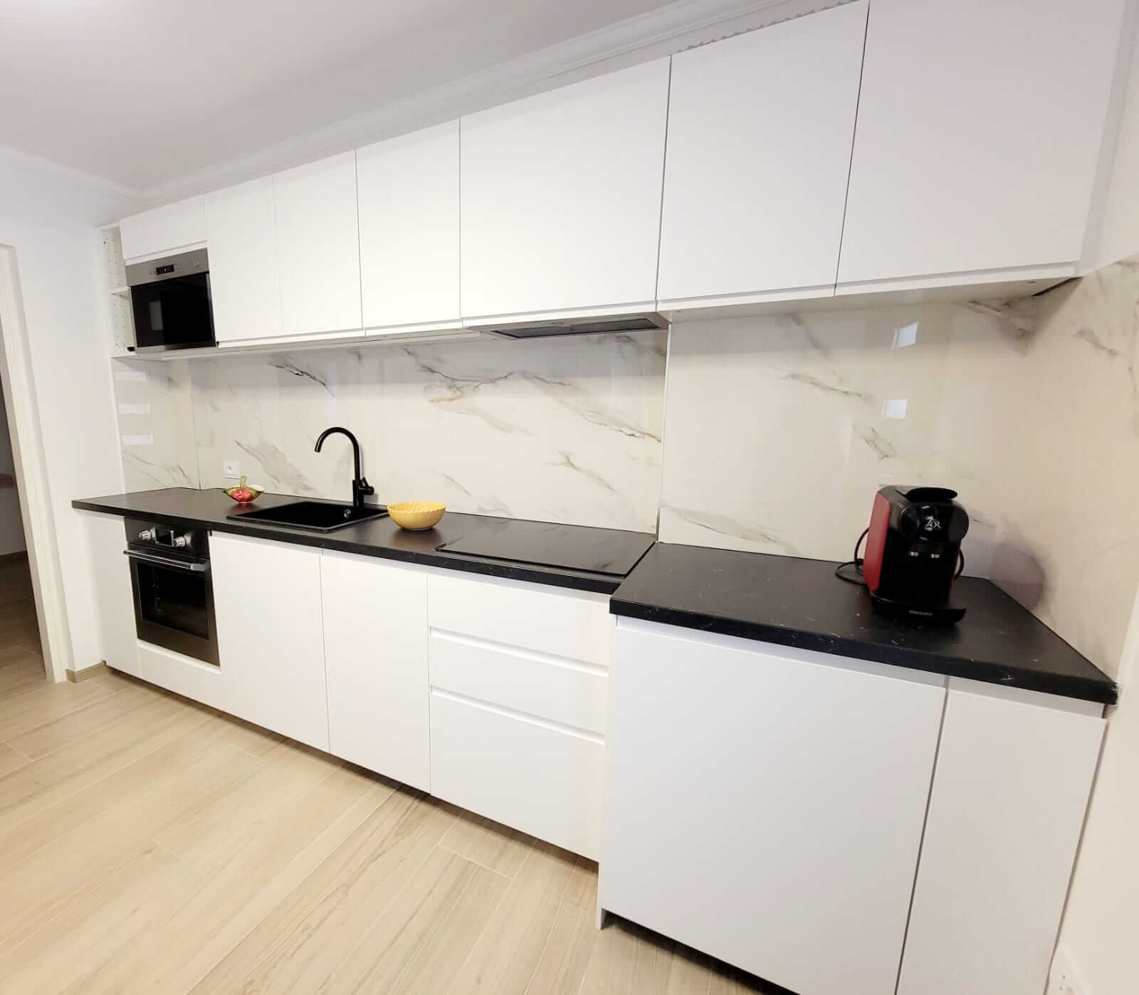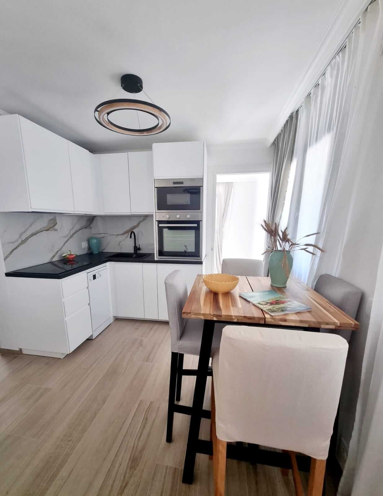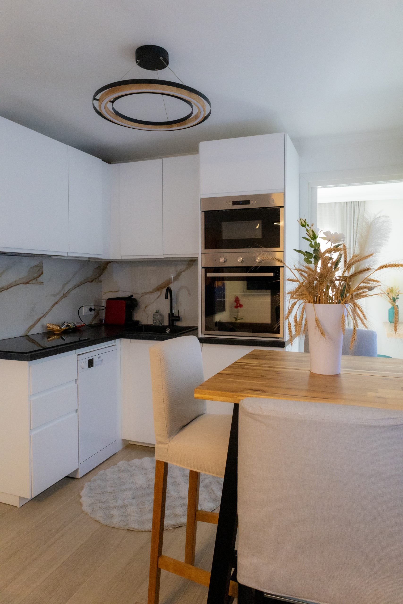 La cuisine, bien équipée, ouverte sur le séjour, comprend une plaque de cuisson, un réfrigérateur/congélateur, un lave-vaisselle et divers ustensiles de cuisine. Vous pourrez également vous faire du café ou du thé grâce à la machine Nespresso et à la bouilloire, tous deux mis à votre disposition.